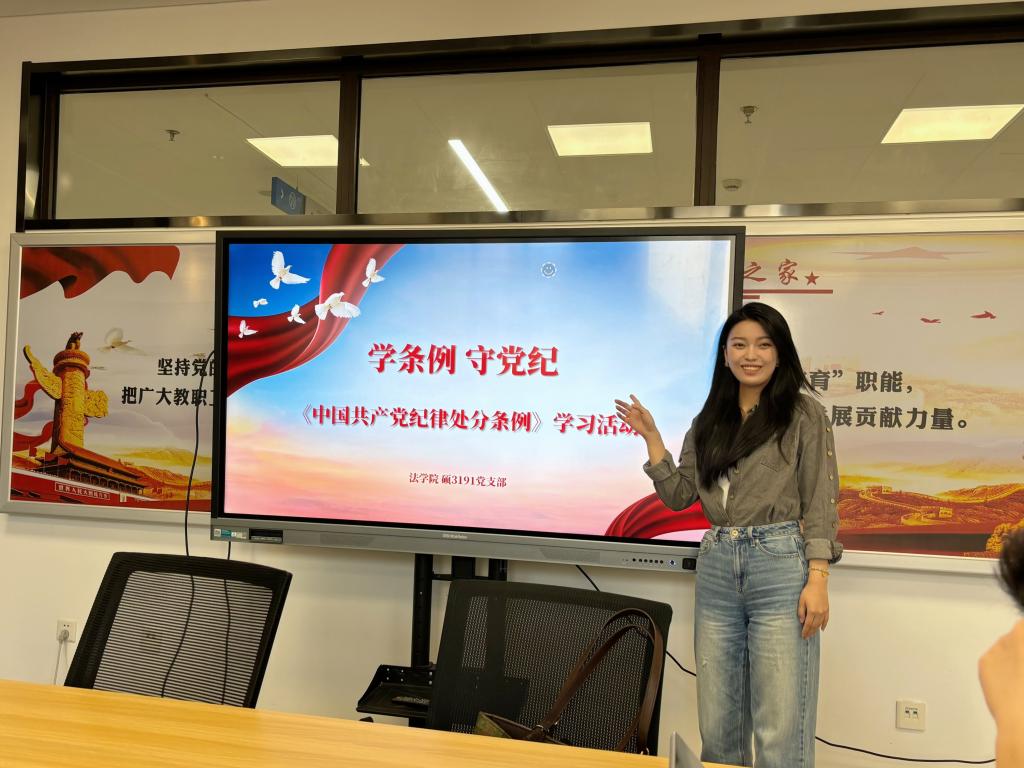 为深入学习贯彻习近平总书记关于党纪学习教育的重要讲话和重要指示精神,引导广大党员干部学纪、知纪、明纪、守纪,自觉用党规党纪校正思想和行动,帮助支部内党员同志深入学习理解、贯彻执行好《条例》,2024年4月25日下午,开云唯一官网_开云(中国)有限公司硕3191党支部全体党员于涵英楼5-3001开展了题为“学条例·守党纪”的《中国共产党纪律处分条例》学习活动。